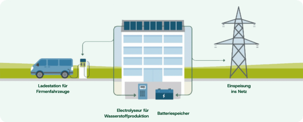 Wasserstoffspeicher ermöglichen eine langfristige Speicherung von Solarstrom. Überschüssiger Strom wird durch Elektrolyse in Wasserstoff umgewandelt und in speziellen Tanks gespeichert. Diese Energie kann durch Blockheizkraftwerke oder Brennstoffzellen in Strom und Wärme rückverwandelt werden.